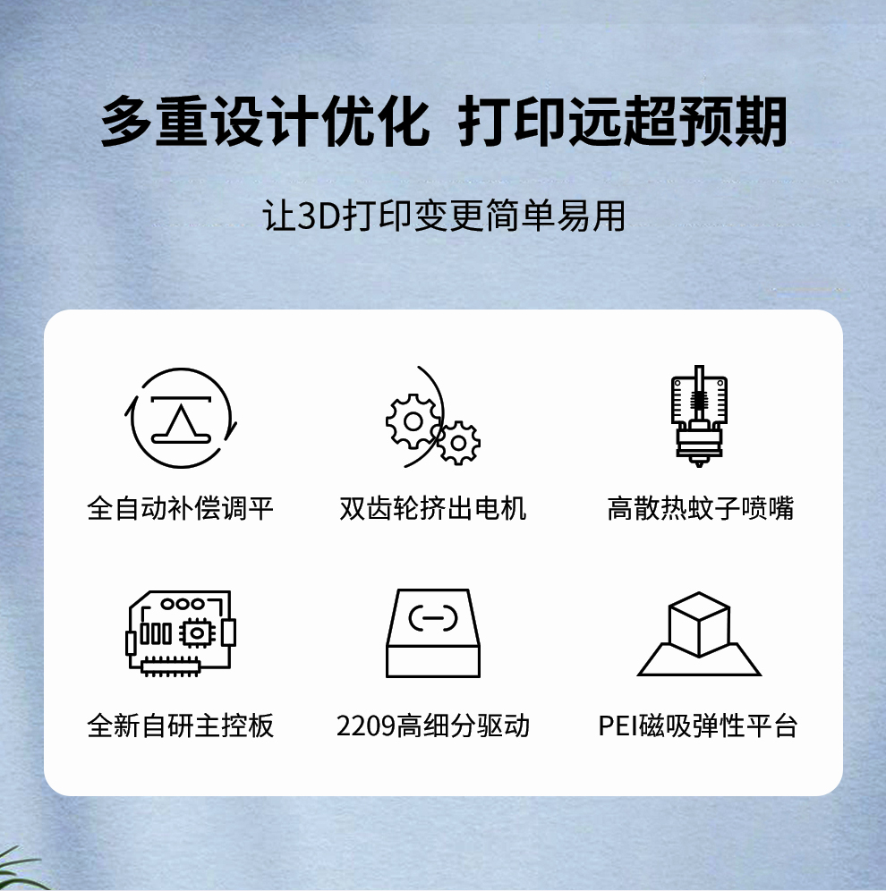 先進熱感控制系統,四軸靜音驅動主板,搭載靜音風扇,你可以享受到安靜無噪音的打印環境,同時為機體及時冷卻散熱,有效避免模型過熱變形等問題。