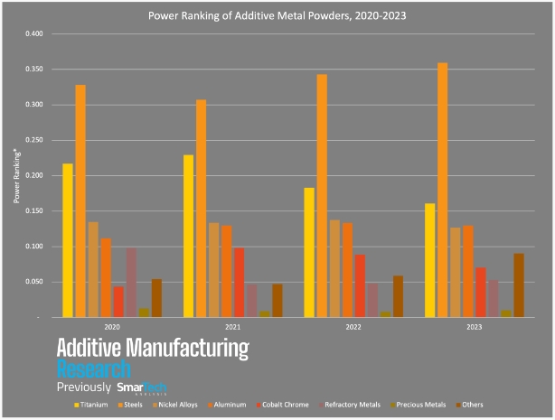 近期,增材制造研究(AMR)公布了一項關于金屬材料使用率的相關調(diào)查結果,從其繪制的最新圖表中可看出金屬增材制造粉末中各種金屬的“實力排名”。
