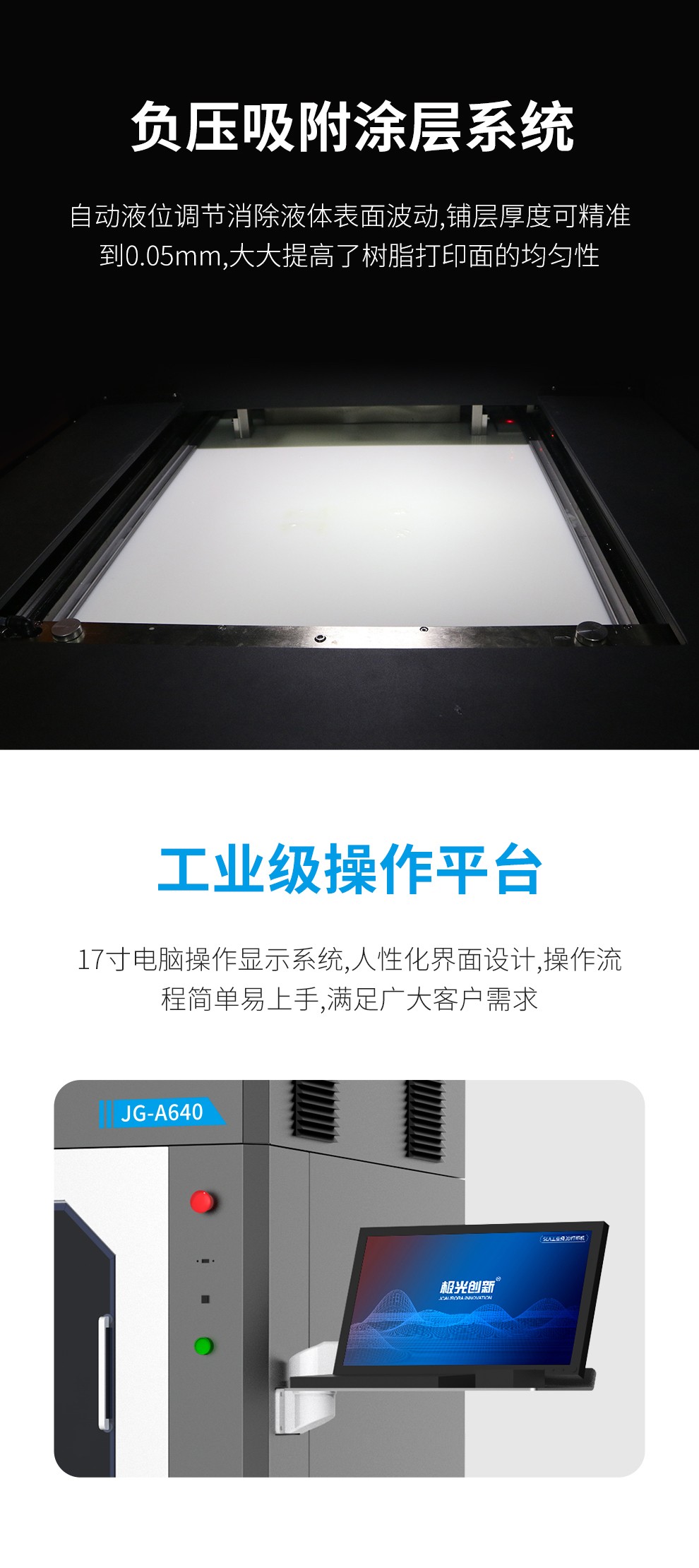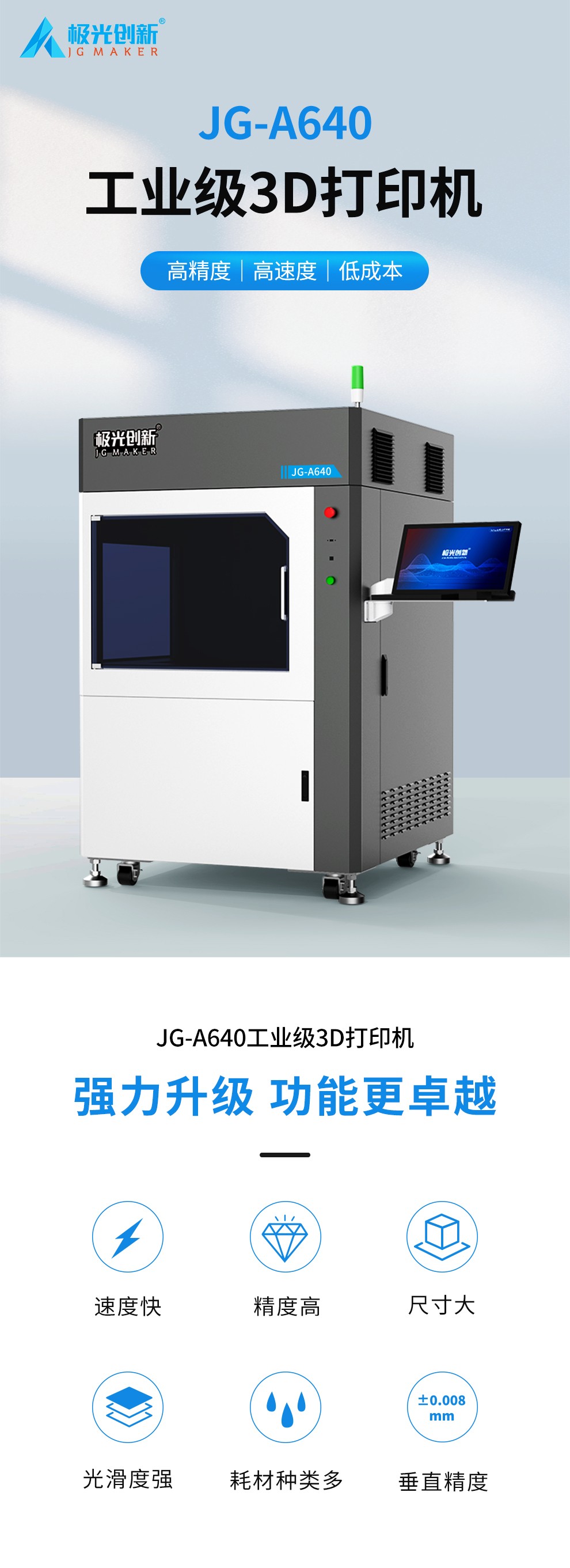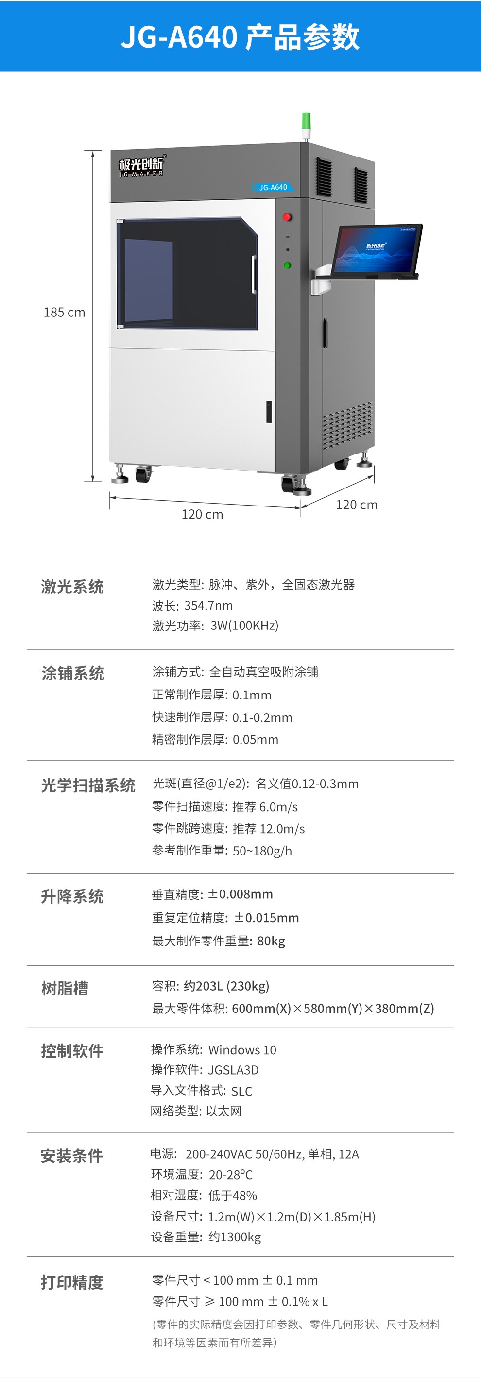 型號JG-A640,其最大成型尺寸可達(dá)600mm(X)*600mm(Y)*400mm(Z),精密制作層厚 0.1mm,極大程度的滿足了用戶對尺寸與精度需求,同時使用全固態(tài)激光器。
