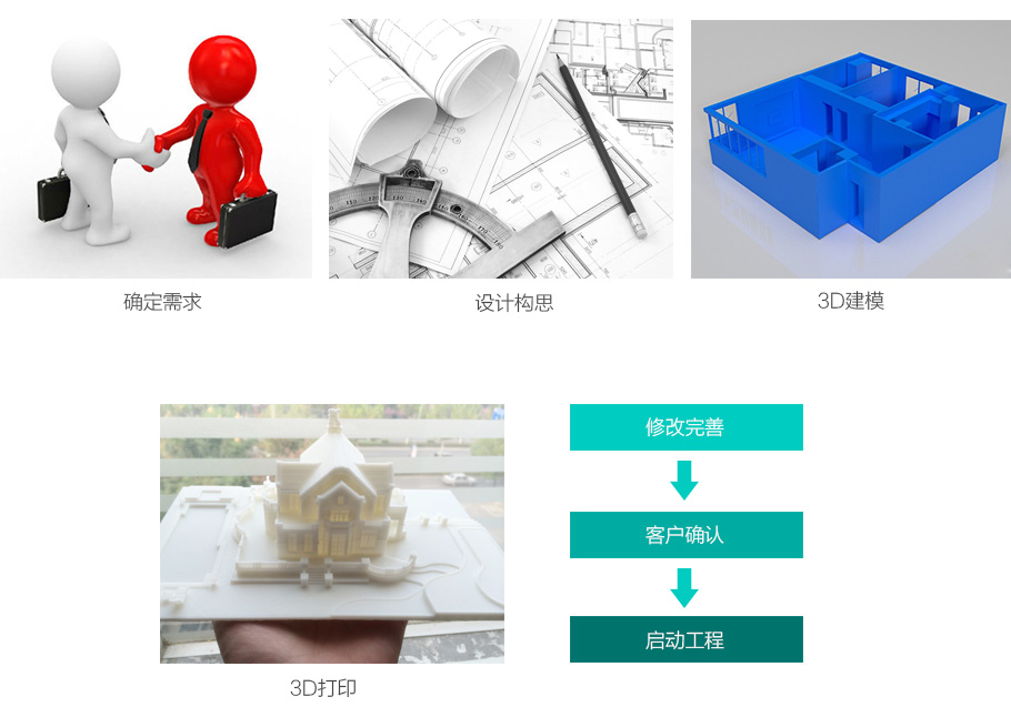 了解客戶需求→構(gòu)思設(shè)計(jì)→3D建?!?D打印出來→修改完善→客戶確認(rèn)→啟動(dòng)工程。